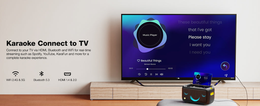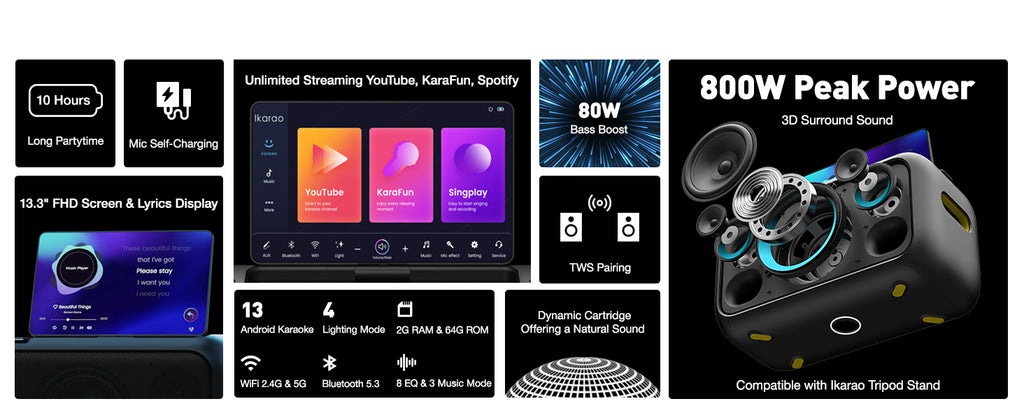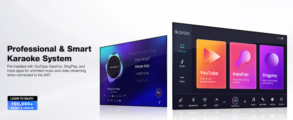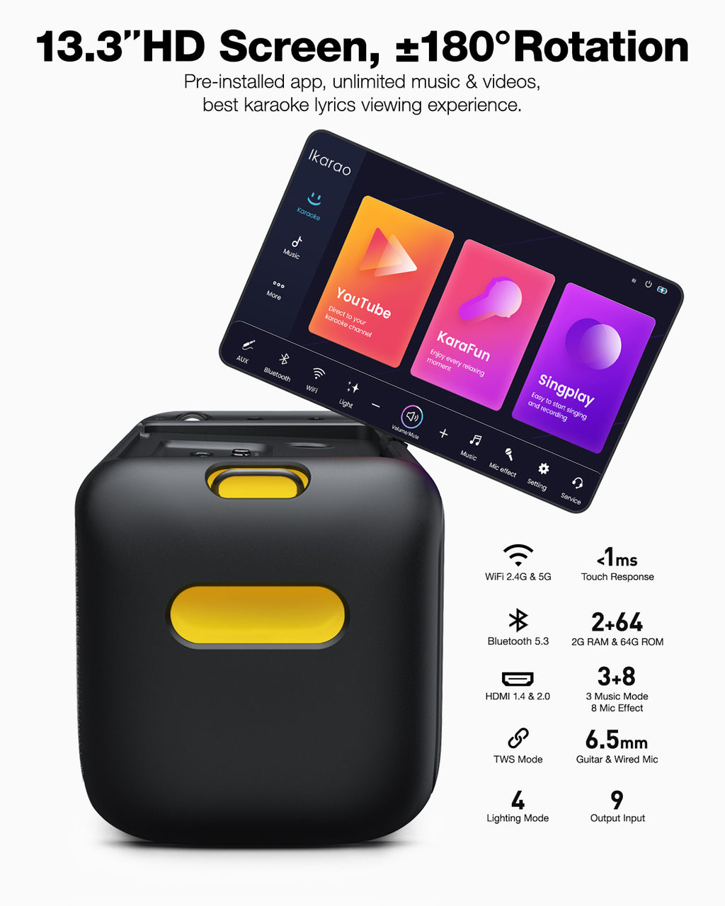 - Pre-installed with popular apps like Karafun and Spotify - WIFI 2.4G and 5 G connections