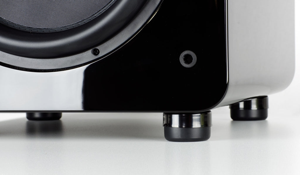 The SoundPath feet screw into existing threaded inserts and subtly elevate the subwoofer on an elastomer cushion encased in stainless steel. It keeps the setup tidy, avoids tall platforms, and suits carpet, hardwood floors and mixed surfaces.