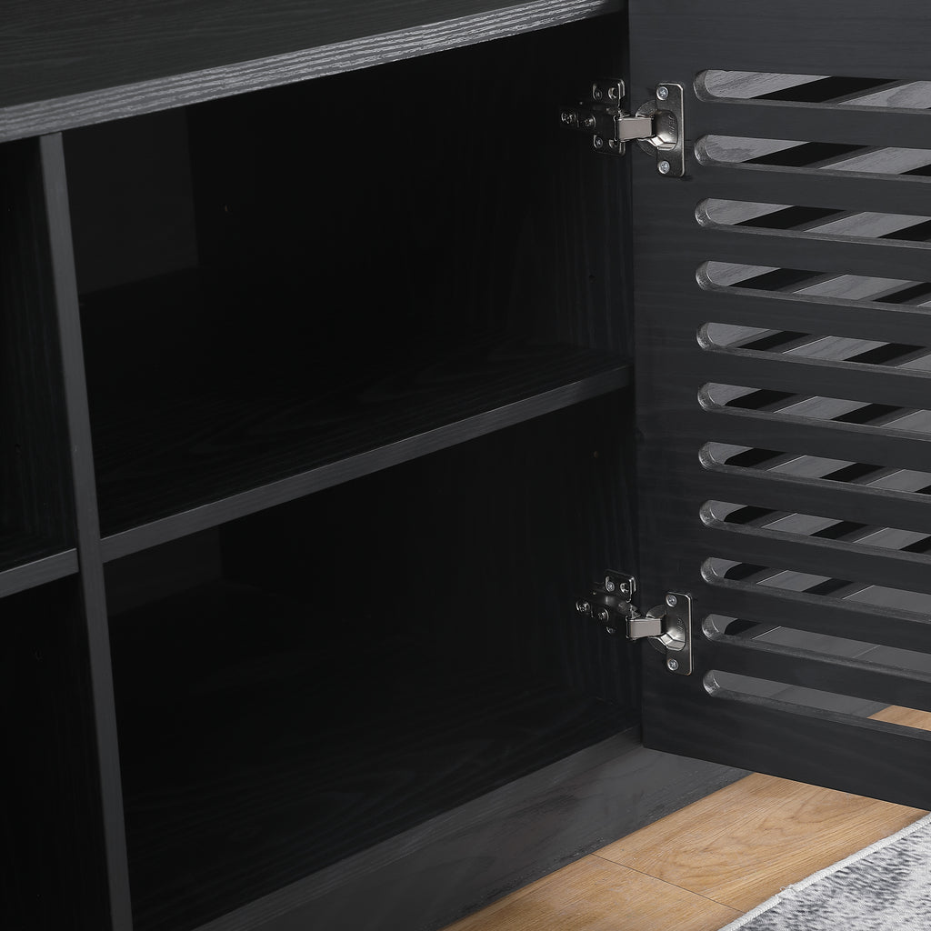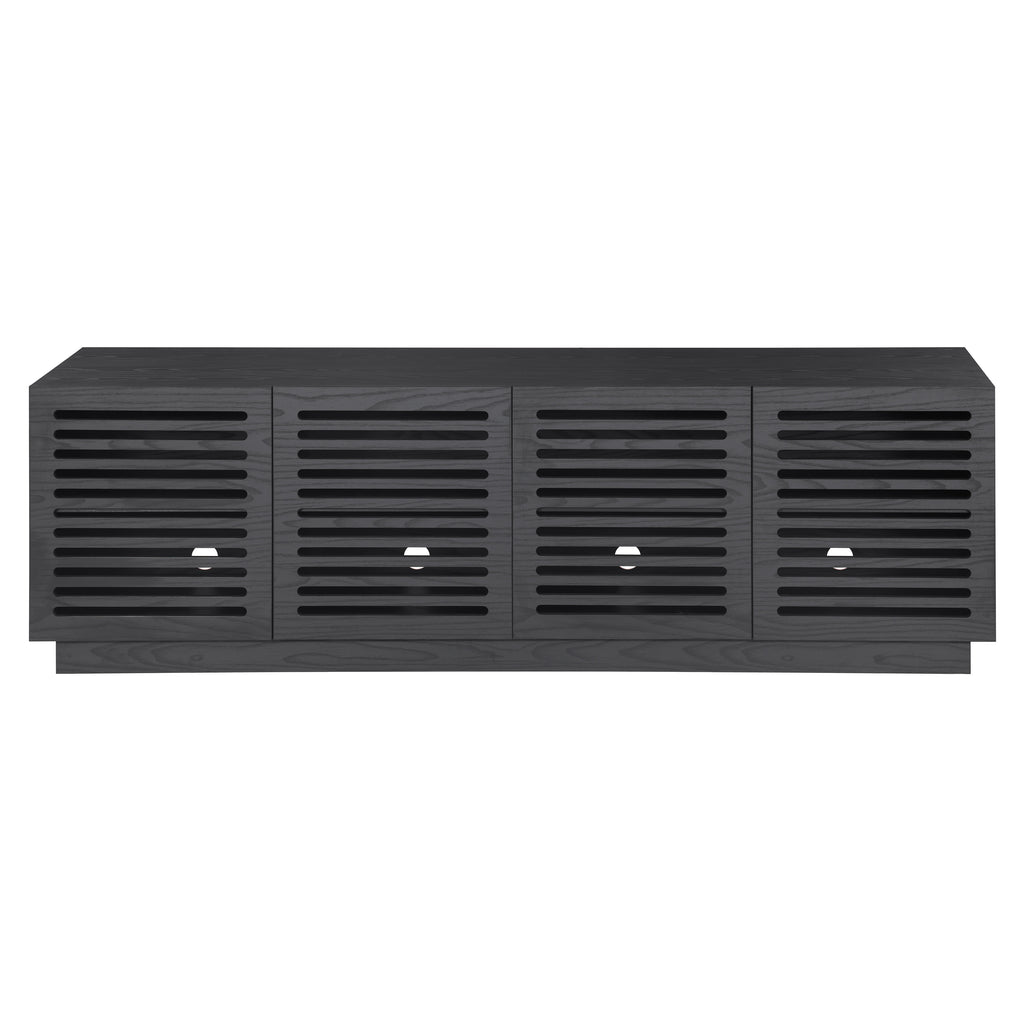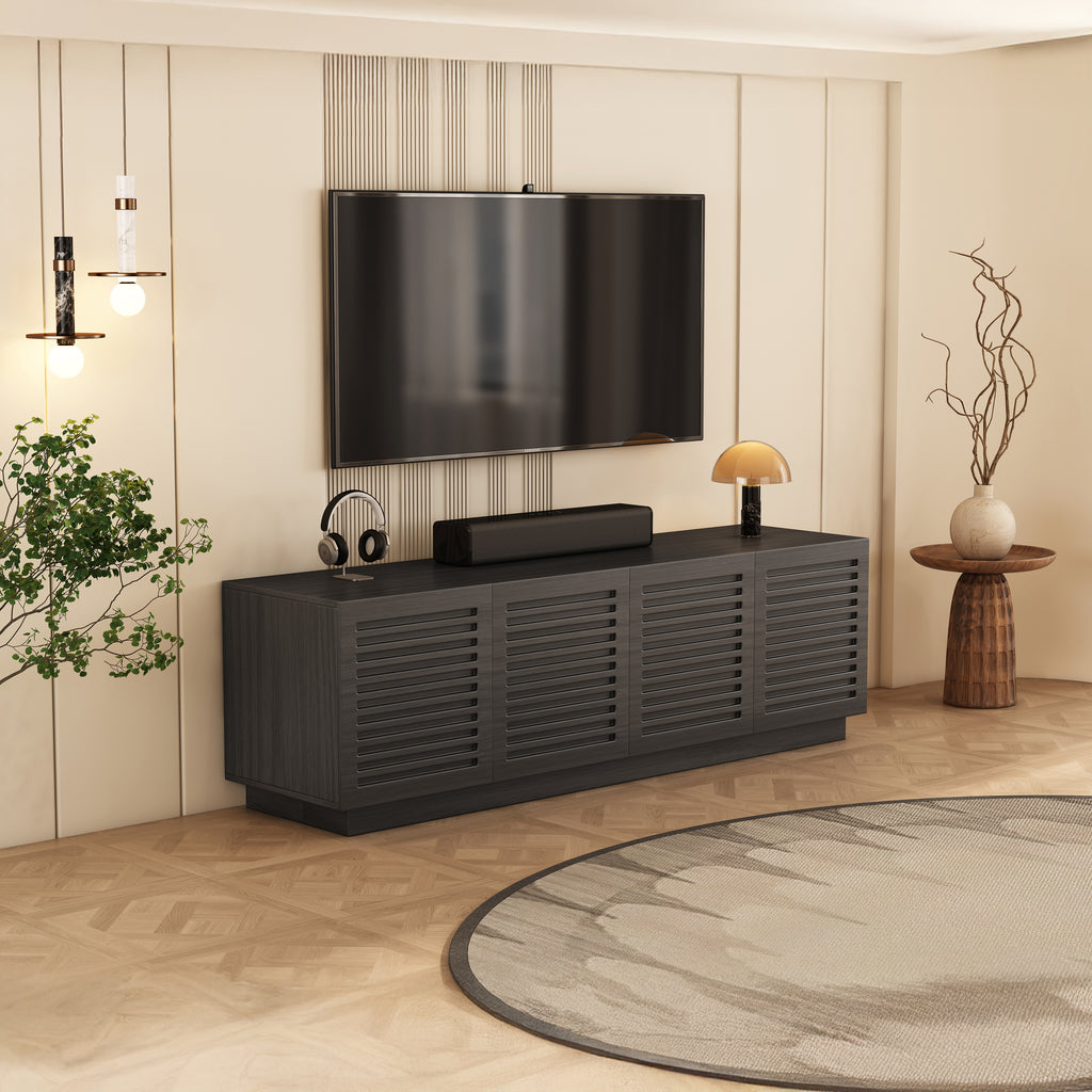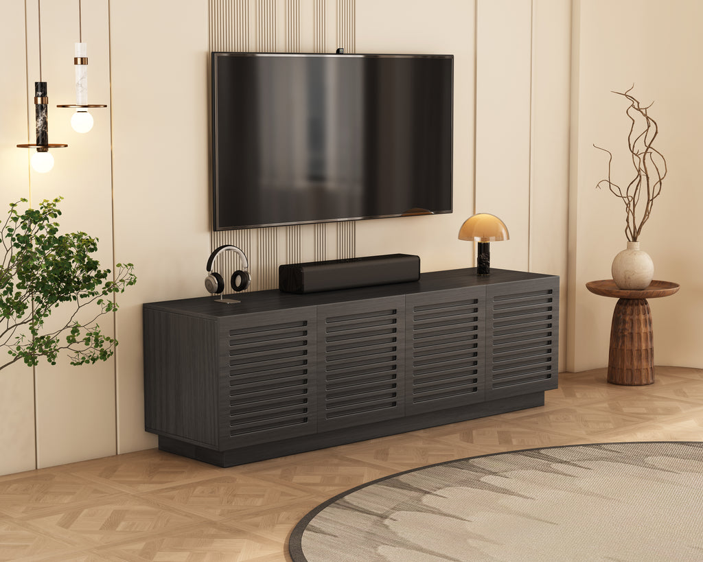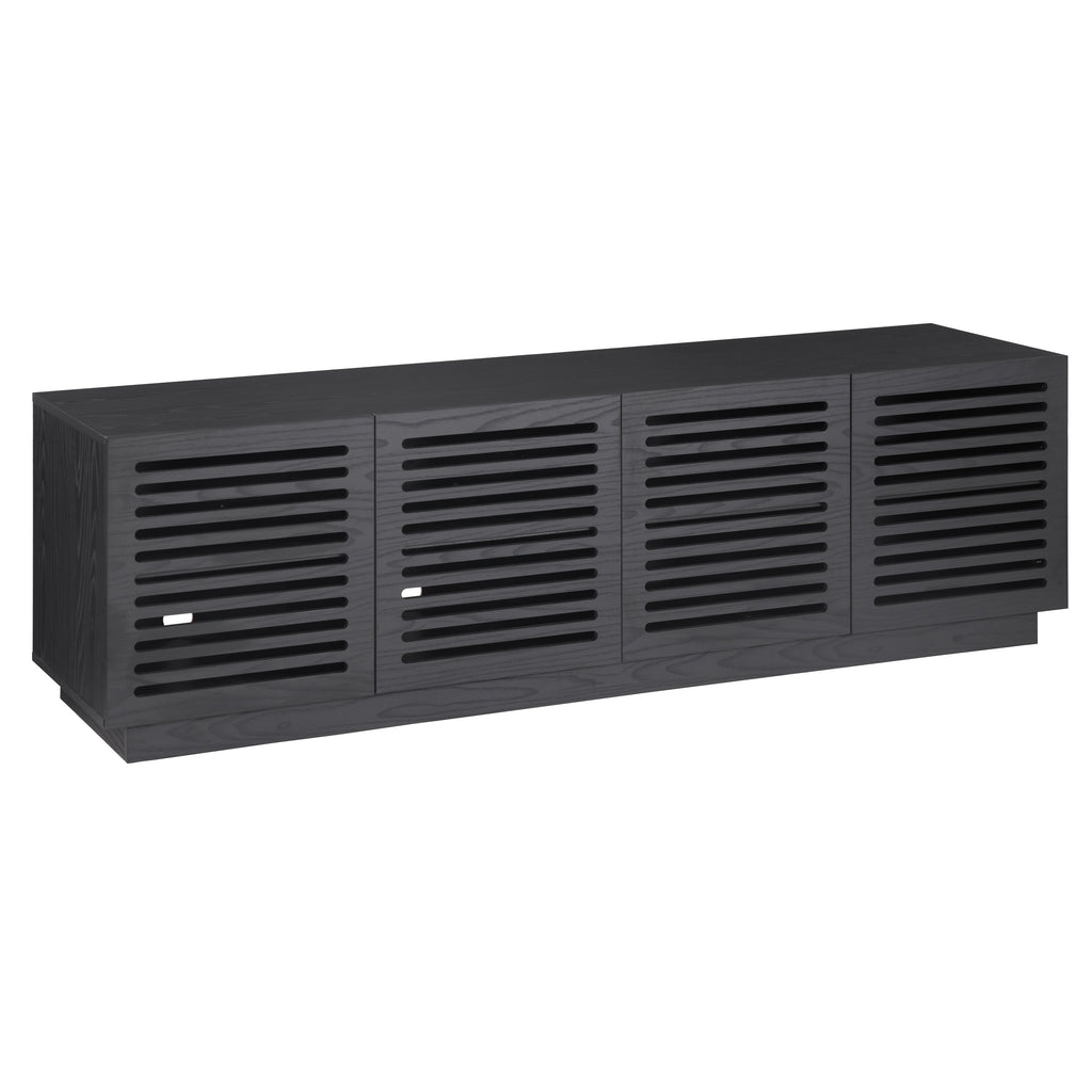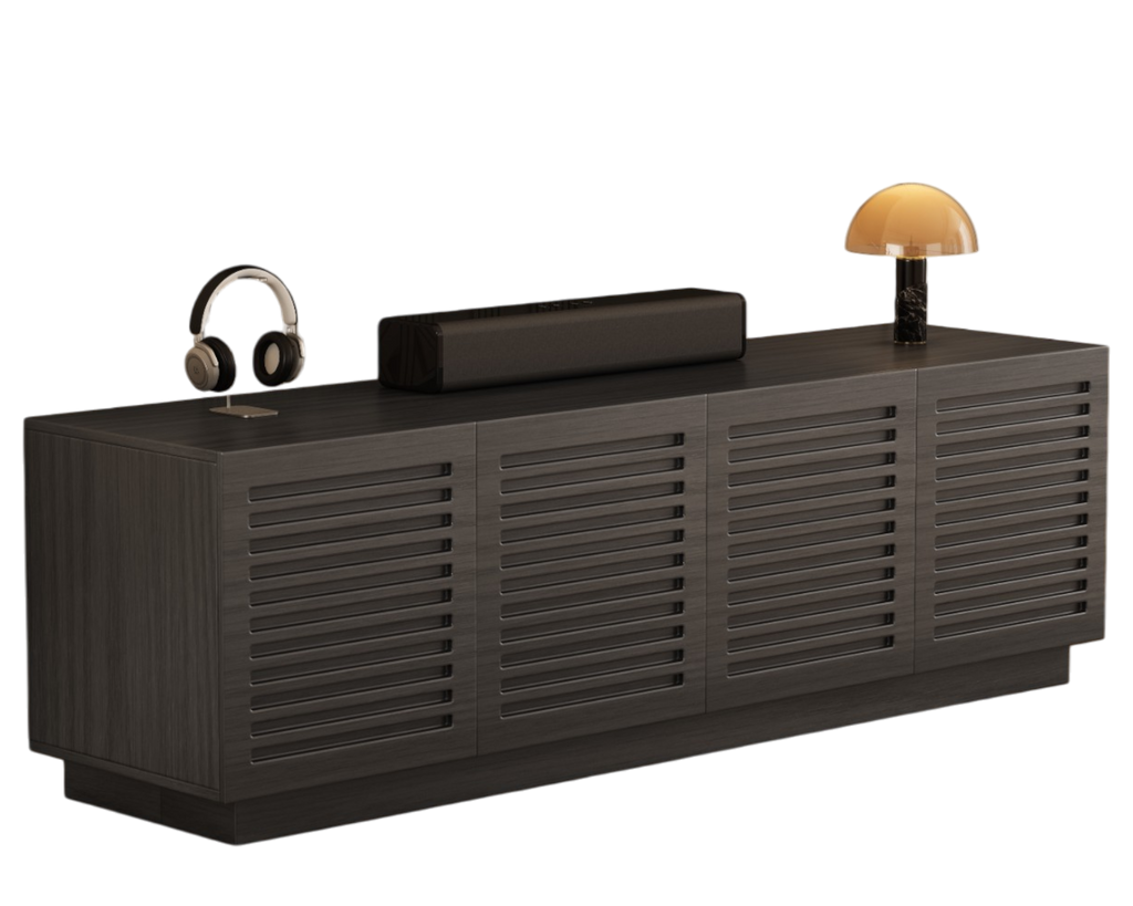 - Four slatted cabinet doors: Sculptural look with practical ventilation for electronics.