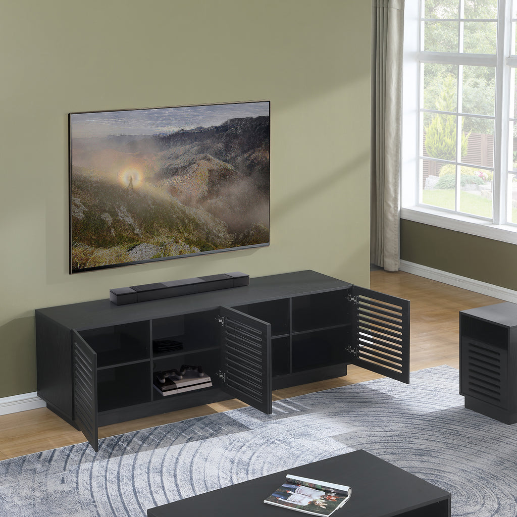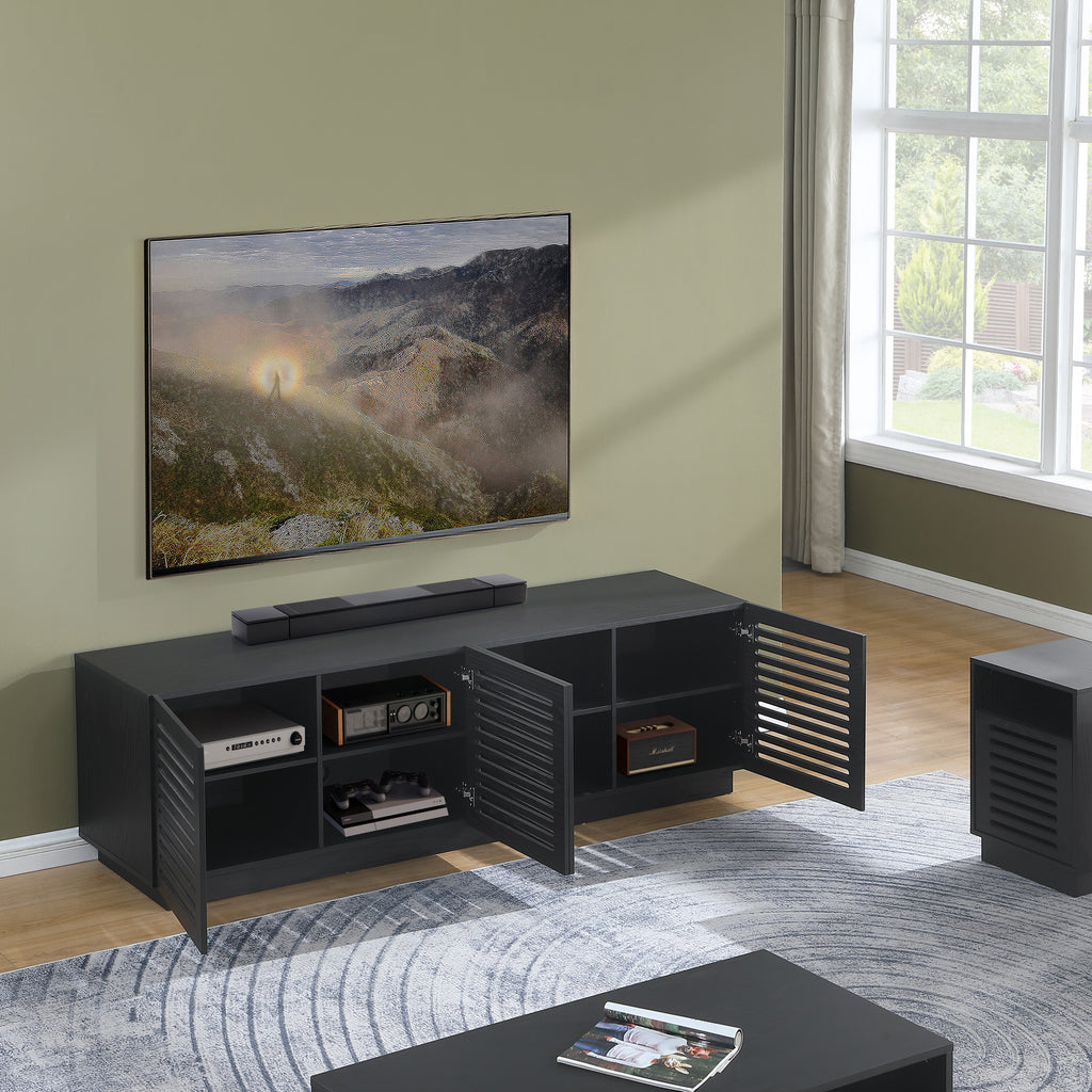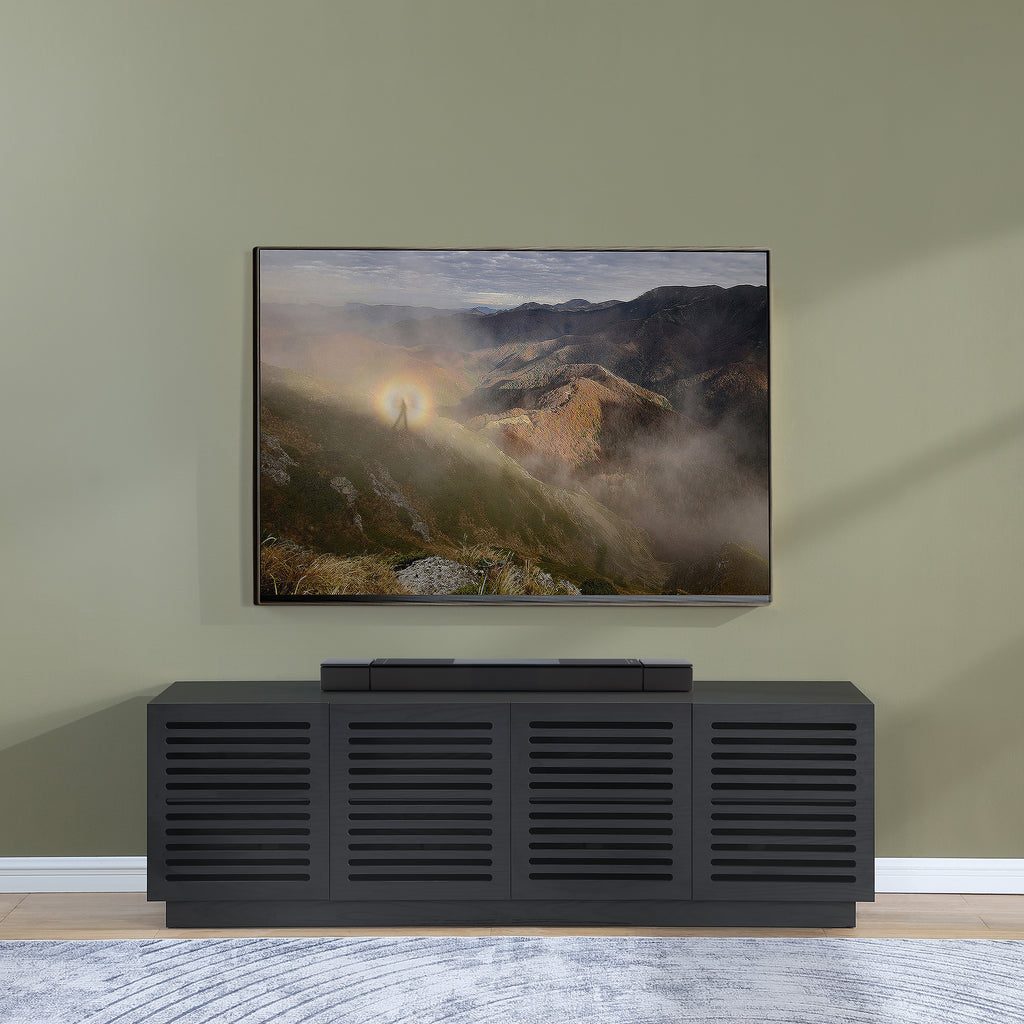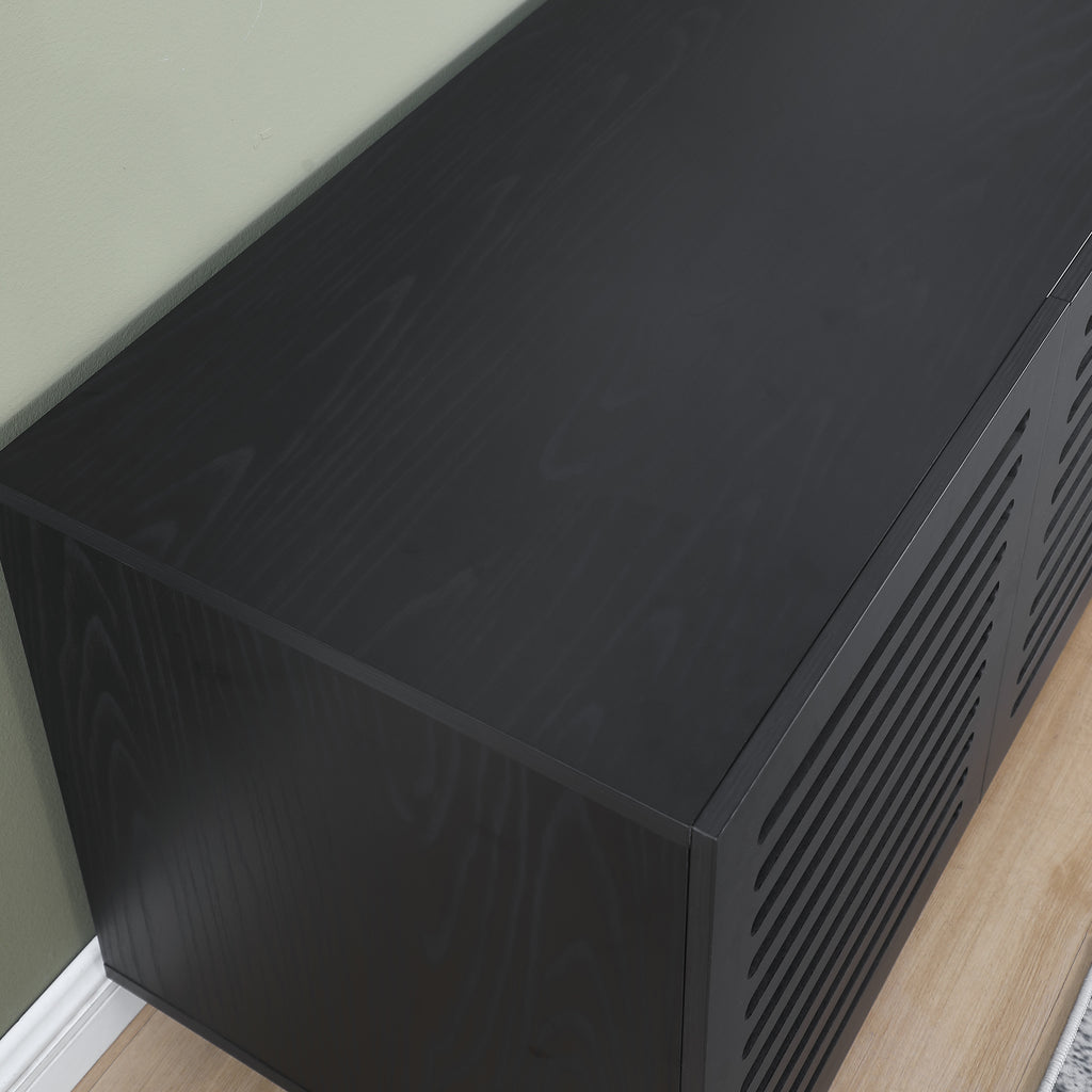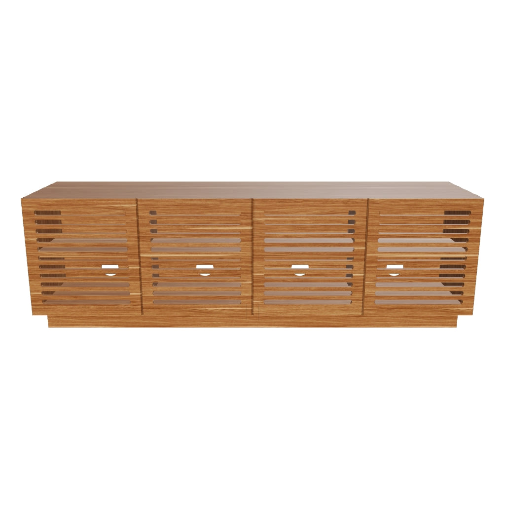 - Four slatted cabinet doors: Sculptural look with practical ventilation for electronics.