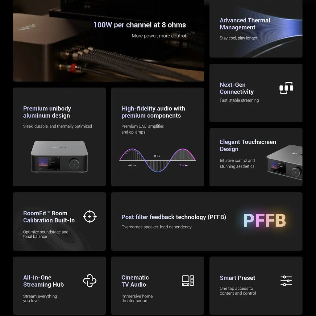 Meet the WiiM Amp Ultra - WiiM's most advanced streaming amplifier yet. Built for music lovers, home theatre buffs, and smart home fans, it delivers a stunning 100W per channel @ 8Ω with ultra-low distortion, pushing high-fidelity audio to every corner of your listening space.
